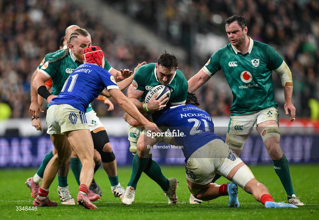 5 February 2026; Jack Conan of Ireland is tackled by Lenni Nouchi of France during the Guinness 6 Nations Rugby Championship match between France and Ireland at Stade de France in Paris, France. Photo by Brendan Moran/Sportsfile