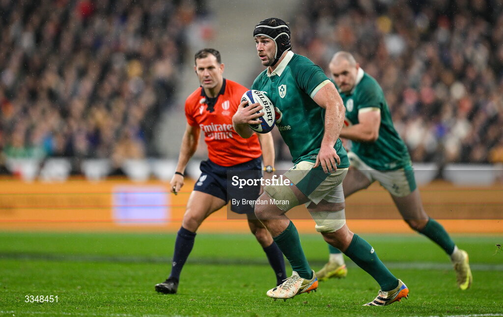 5 February 2026; Caelan Doris of Ireland during the Guinness 6 Nations Rugby Championship match between France and Ireland at Stade de France in Paris, France. Photo by Brendan Moran/Sportsfile