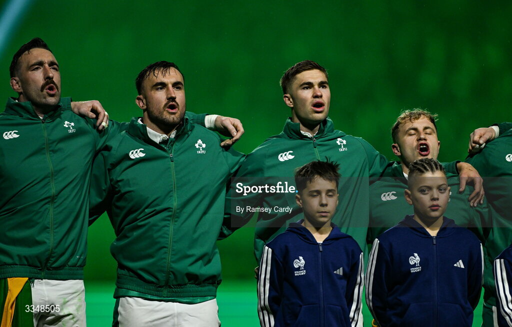 5 February 2026; Ireland players, from left, Jack Conan, Rónan Kelleher, Jack Crowley and Craig Casey before the Guinness 6 Nations Rugby Championship match between France and Ireland at Stade de France in Paris, France. Photo by Ramsey Cardy/Sportsfile