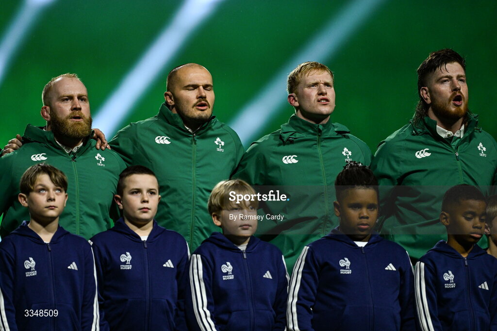 5 February 2026; Ireland players, from left, Jeremy Loughman, Jacob Stockdale, Jamie Osborne and Joe McCarthy before the Guinness 6 Nations Rugby Championship match between France and Ireland at Stade de France in Paris, France. Photo by Ramsey Cardy/Sportsfile
