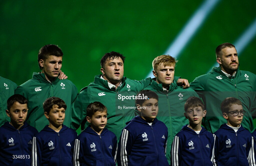 5 February 2026; Ireland players, from left, Sam Prendergast, Thomas Clarkson, Tommy O'Brien and Stuart McCloskey before the Guinness 6 Nations Rugby Championship match between France and Ireland at Stade de France in Paris, France. Photo by Ramsey Cardy/Sportsfile