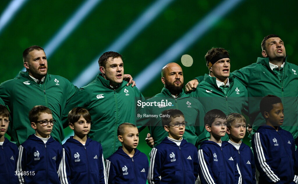 5 February 2026; Ireland players, from left, Stuart McCloskey, Garry Ringrose, Jamison Gibson-Park, Josh van der Flier and Tadhg Beirne before the Guinness 6 Nations Rugby Championship match between France and Ireland at Stade de France in Paris, France. Photo by Ramsey Cardy/Sportsfile