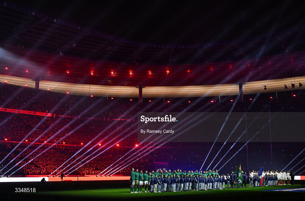 5 February 2026; The Ireland and France teams before the Guinness 6 Nations Rugby Championship match between France and Ireland at Stade de France in Paris, France. Photo by Ramsey Cardy/Sportsfile