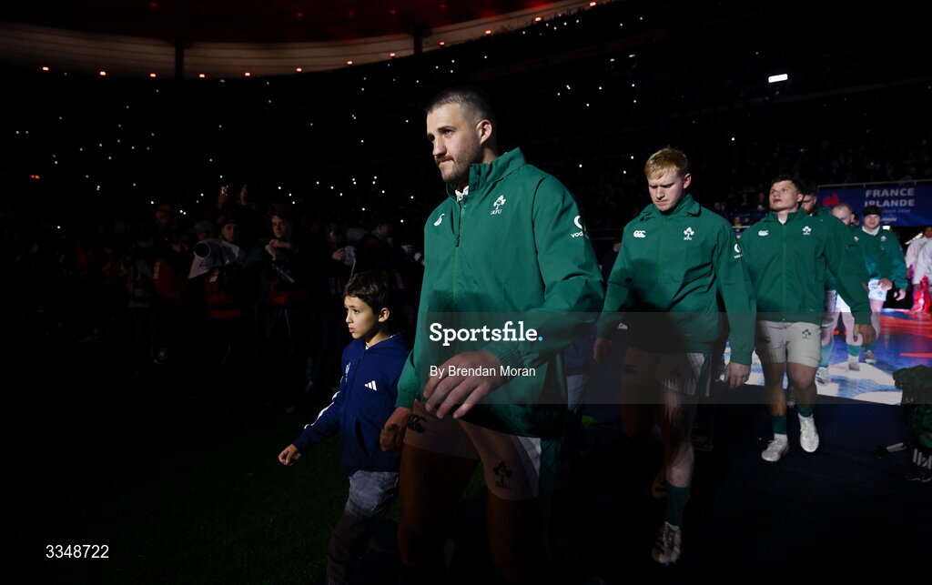 5 February 2026; Stuart McCloskey of Ireland walks onto the pitch before the Guinness 6 Nations Rugby Championship match between France and Ireland at Stade de France in Paris, France. Photo by Brendan Moran/Sportsfile