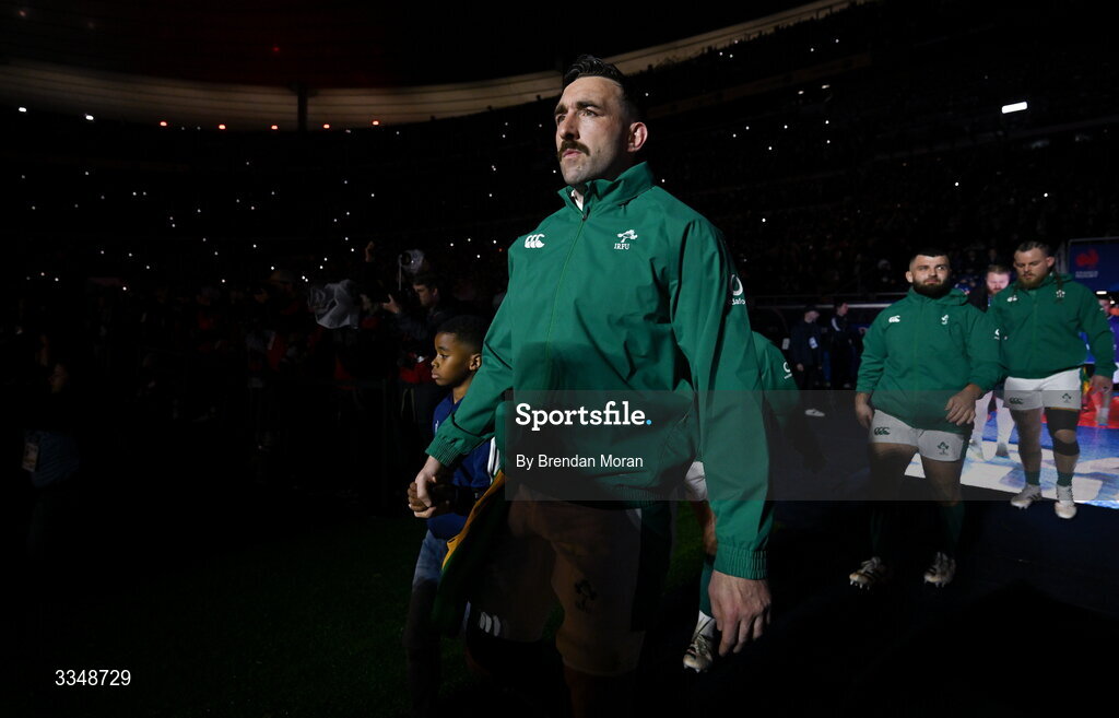 5 February 2026; Jack Conan of Ireland walks onto the pitch before the Guinness 6 Nations Rugby Championship match between France and Ireland at Stade de France in Paris, France. Photo by Brendan Moran/Sportsfile