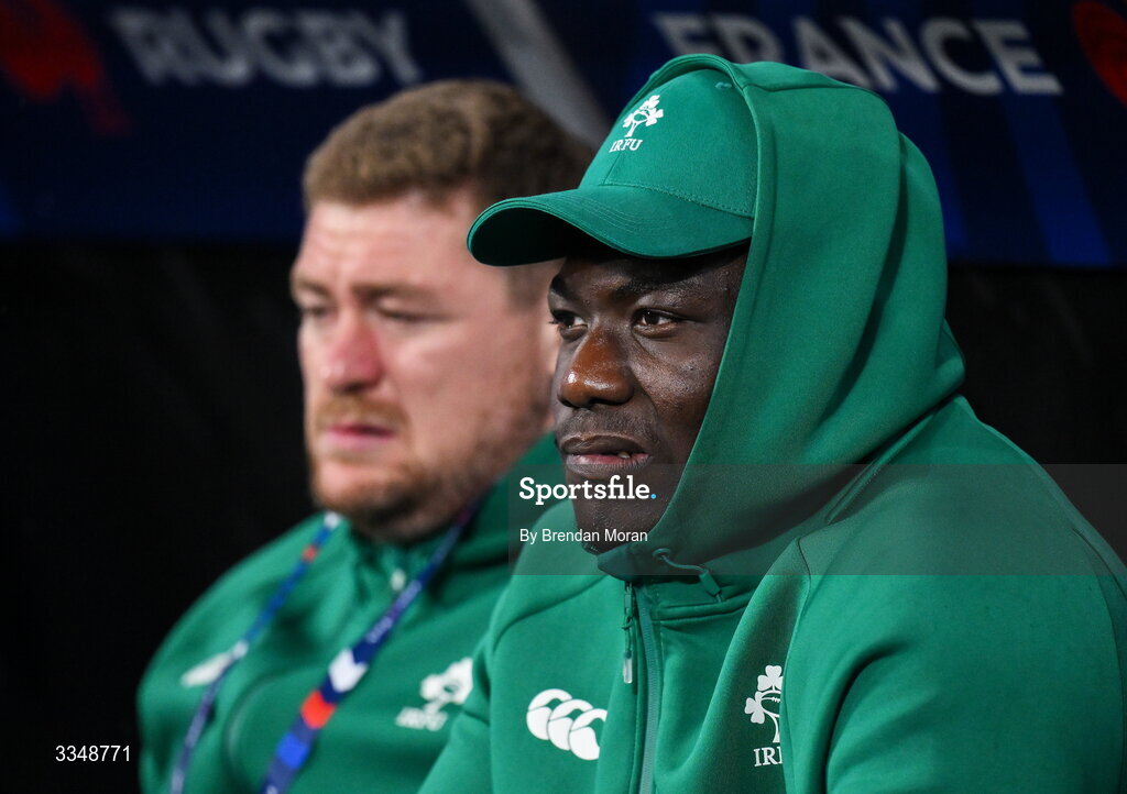5 February 2026; Edwin Edogbo of Ireland sits on thebench during the Guinness 6 Nations Rugby Championship match between France and Ireland at Stade de France in Paris, France. Photo by Brendan Moran/Sportsfile