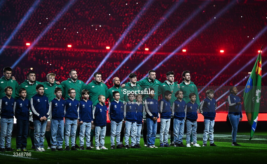 5 February 2026; Ireland players, from left, Sam Prendergast, Thomas Clarkson, Tommy O'Brien, Stuart McCloskey, Garry Ringrose, Jamison Gibson-Park, Josh van der Flier, Tadhg Beirne, Dan Sheehan and captain Caelan Doris stand for the national anthems before during the Guinness 6 Nations Rugby Championship match between France and Ireland at Stade de France in Paris, France. Photo by Brendan Moran/Sportsfile