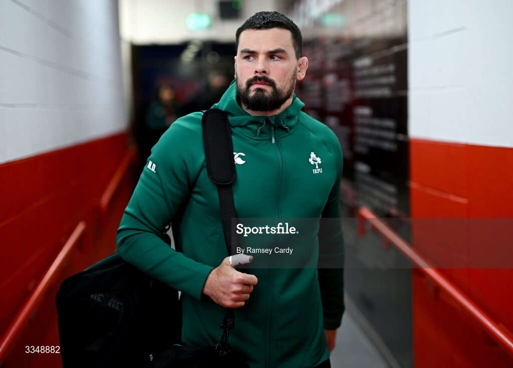 6 February 2026; Ireland XV captain Max Deegan arrives before the representative fixture rugby union match between Ireland XV and England A at Thomond Park in Limerick. Photo by Ramsey Cardy/Sportsfile