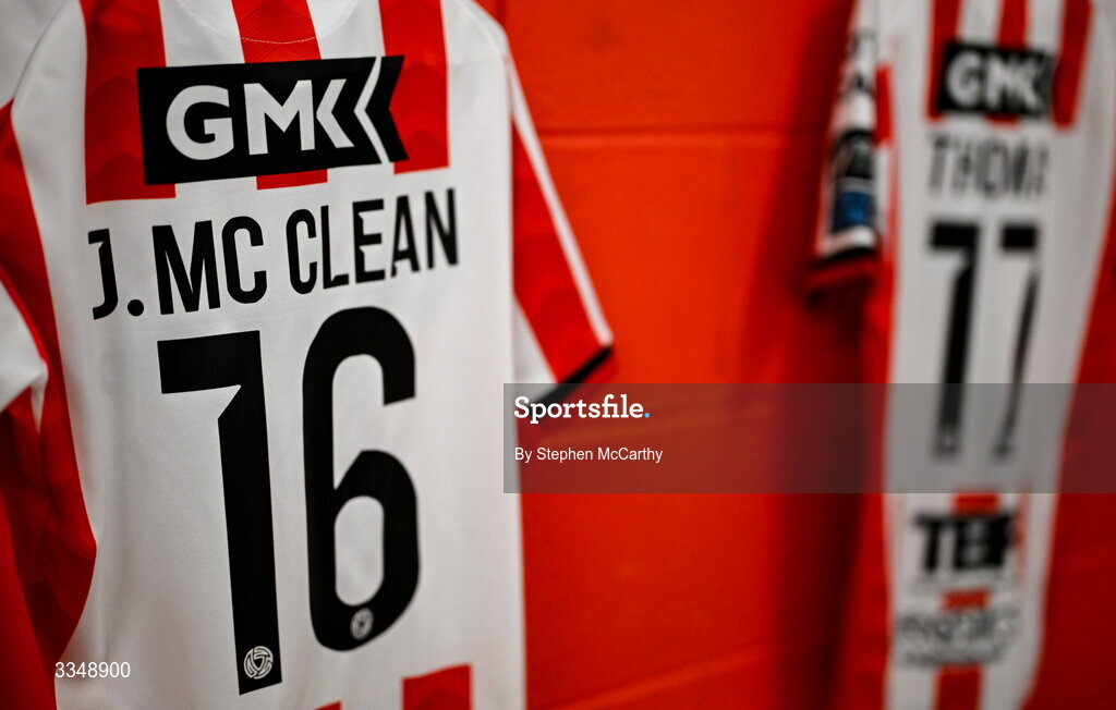 6 February 2026; The jersey of James McClean hangs in the Derry City dressing room before the SSE Airtricity Men's Premier Division match between Derry City and Sligo Rovers at The Ryan McBride Brandywell Stadium in Derry. Photo by Stephen McCarthy/Sportsfile