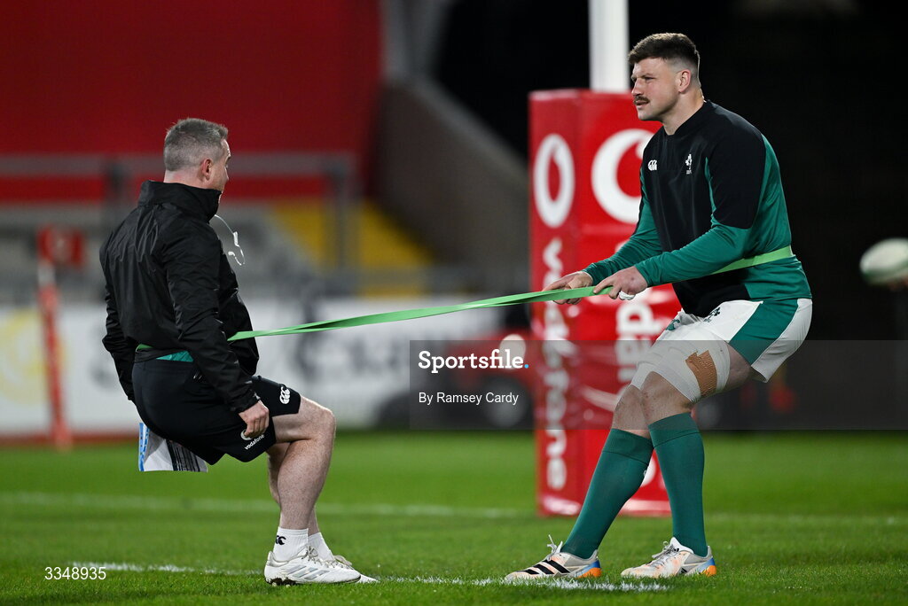 6 February 2026; Fineen Wycherley of Ireland XV warms up before the representative fixture rugby union match between Ireland XV and England A at Thomond Park in Limerick. Photo by Ramsey Cardy/Sportsfile
