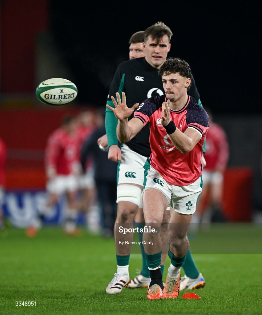 6 February 2026; Joshua Kenny of Ireland XV warms up before the representative fixture rugby union match between Ireland XV and England A at Thomond Park in Limerick. Photo by Ramsey Cardy/Sportsfile