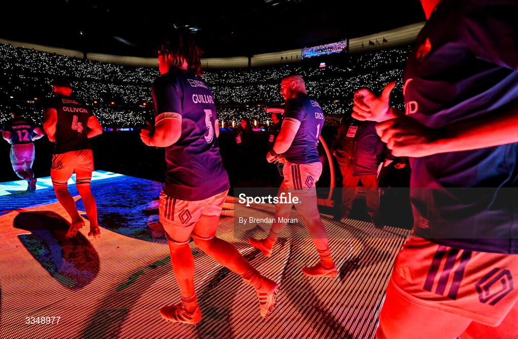 5 February 2026; France players, from left, Charles Ollivon, Mickaël Guillard and Jean-Baptiste Gros make their way oto the pitch for the second half of the Guinness 6 Nations Rugby Championship match between France and Ireland at Stade de France in Paris, France. Photo by Brendan Moran/Sportsfile