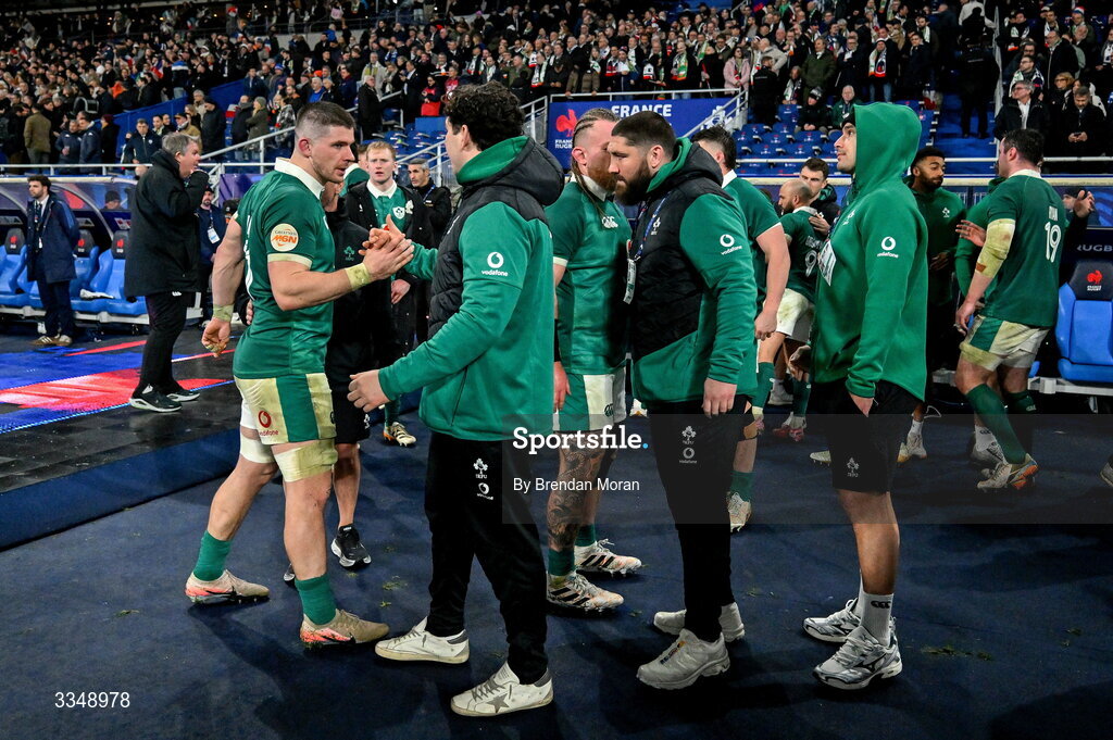 5 February 2026; Nick Timoney of Ireland, left, with teammates Tom Stewart and Tom O’Toole the Guinness 6 Nations Rugby Championship match between France and Ireland at Stade de France in Paris, France. Photo by Brendan Moran/Sportsfile