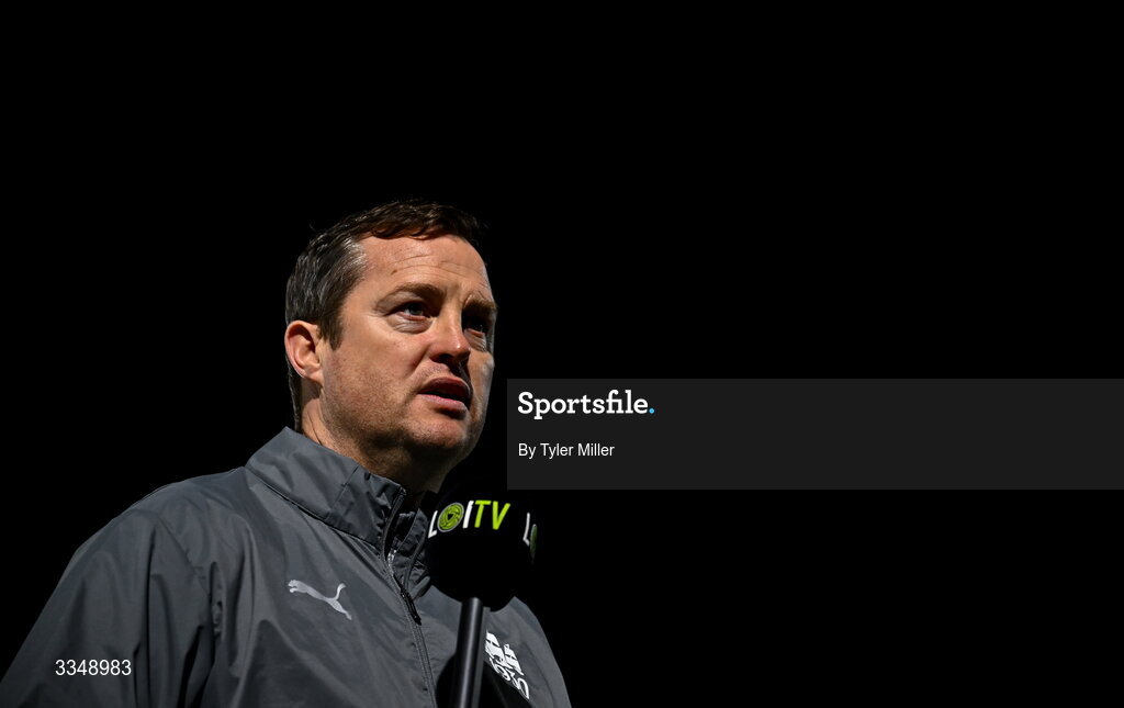 6 February 2026; Waterford manager Jon Daly is interviewed for LOITV before the SSE Airtricity Men's Premier Division match between Waterford and Shelbourne at the Regional Sports Centre in Waterford. Photo by Tyler Miller/Sportsfile