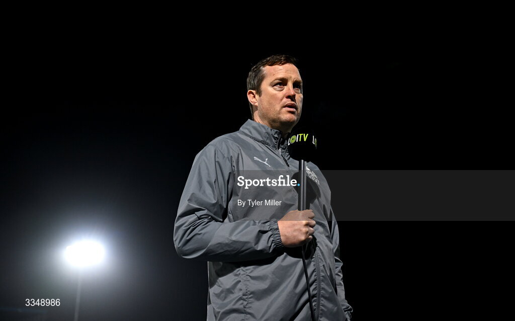 6 February 2026; Waterford manager Jon Daly is interviewed for LOITV before the SSE Airtricity Men's Premier Division match between Waterford and Shelbourne at the Regional Sports Centre in Waterford. Photo by Tyler Miller/Sportsfile