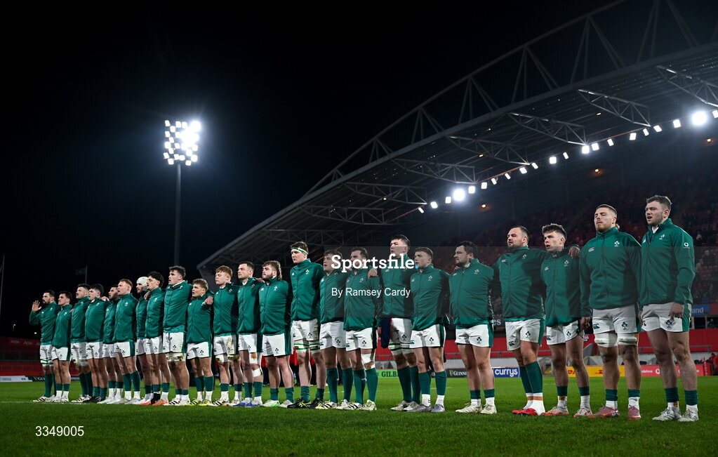 6 February 2026; The Ireland team stand for Ireland's Call before the representative fixture rugby union match between Ireland XV and England A at Thomond Park in Limerick. Photo by Ramsey Cardy/Sportsfile