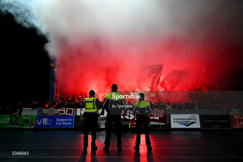6 February 2026; Members of An Garda Síochána stand infront of Shelbourne supporters as they set off flares before the SSE Airtricity Men's Premier Division match between Waterford and Shelbourne at the Regional Sports Centre in Waterford. Photo by Tyler Miller/Sportsfile