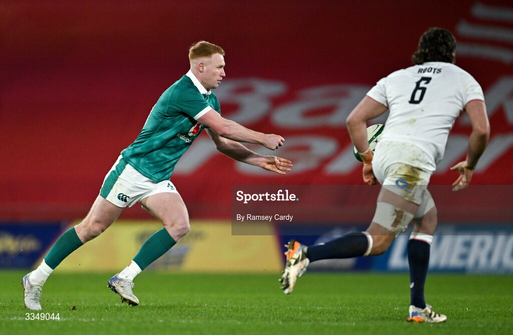 6 February 2026; Ciarán Frawley of Ireland XV during the representative fixture rugby union match between Ireland XV and England A at Thomond Park in Limerick. Photo by Ramsey Cardy/Sportsfile