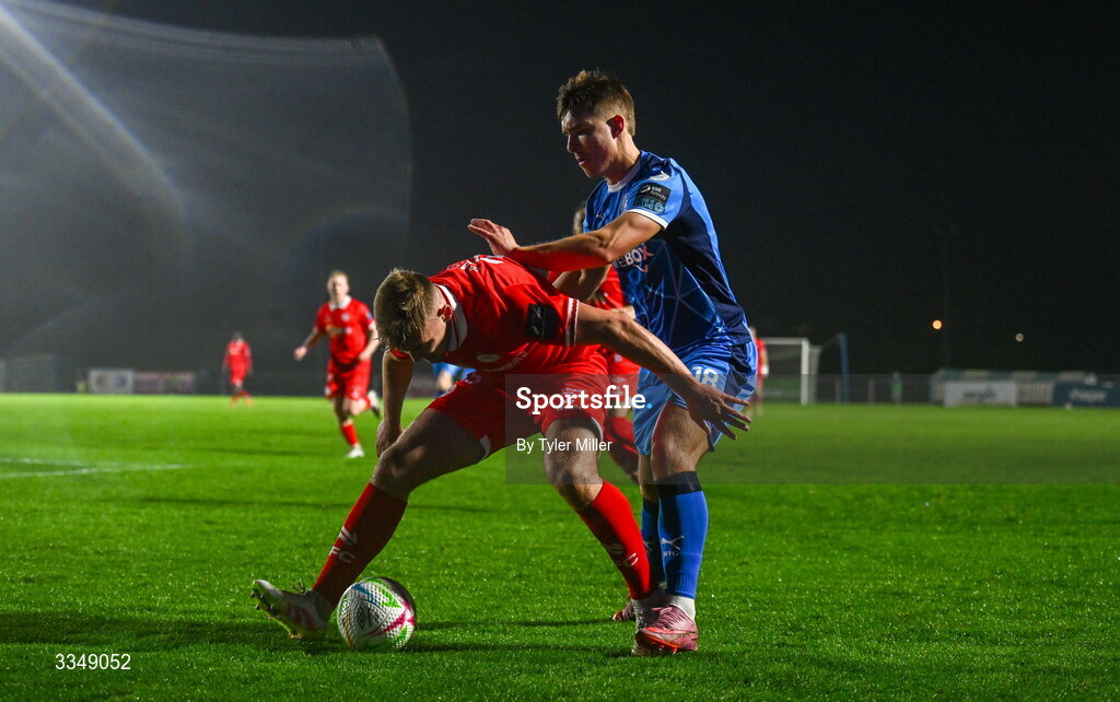 6 February 2026; Odhrán Casey of Shelbourne in action against Tommy Lonergan of Waterford during the SSE Airtricity Men's Premier Division match between Waterford and Shelbourne at the Regional Sports Centre in Waterford. Photo by Tyler Miller/Sportsfile