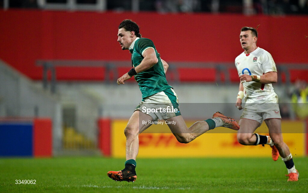 6 February 2026; Joshua Kenny of Ireland XV on his way to scoring his side's second try during the representative fixture rugby union match between Ireland XV and England A at Thomond Park in Limerick. Photo by Ramsey Cardy/Sportsfile