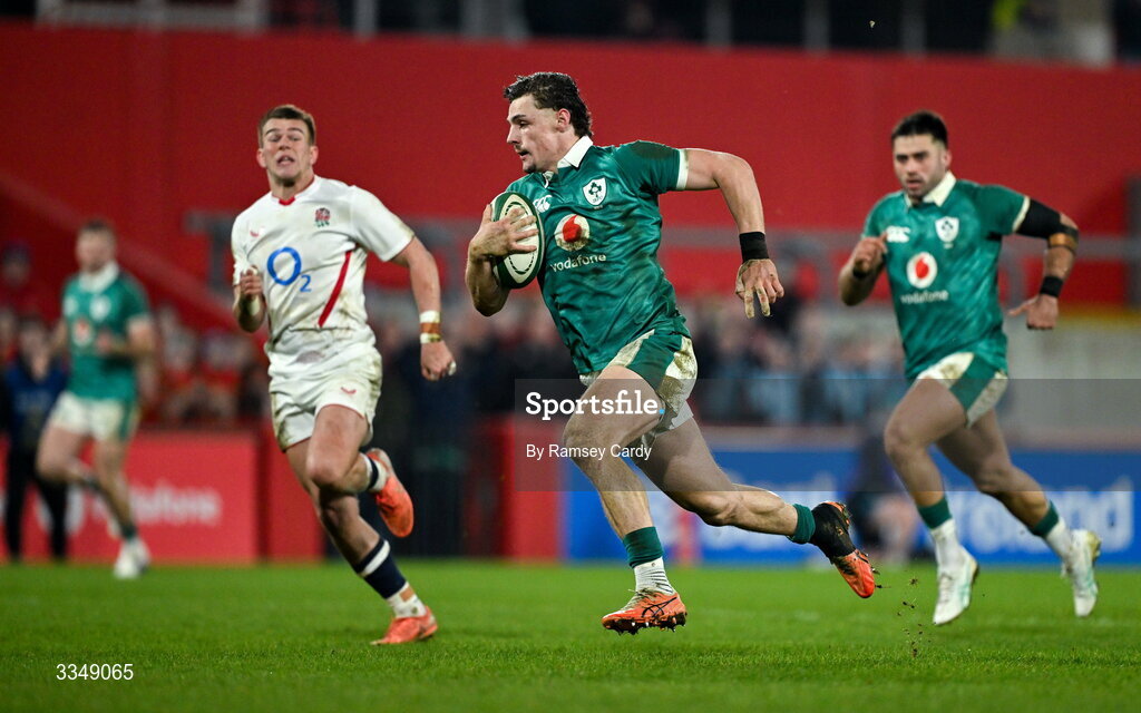 6 February 2026; Joshua Kenny of Ireland XV on his way to scoring his side's second try during the representative fixture rugby union match between Ireland XV and England A at Thomond Park in Limerick. Photo by Ramsey Cardy/Sportsfile