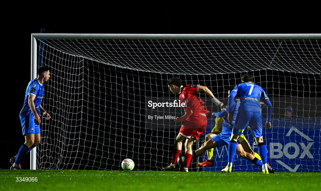6 February 2026; John Martin of Shelbourne shoots to score his side's first goal during the SSE Airtricity Men's Premier Division match between Waterford and Shelbourne at the Regional Sports Centre in Waterford. Photo by Tyler Miller/Sportsfile