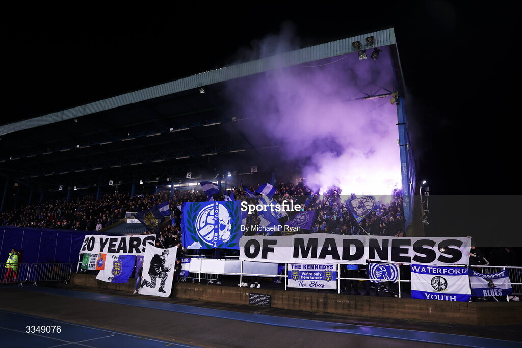 6 February 2026; Waterford supporters during the SSE Airtricity Men's Premier Division match between Waterford and Shelbourne at the Regional Sports Centre in Waterford. Photo by Michael P Ryan/Sportsfile