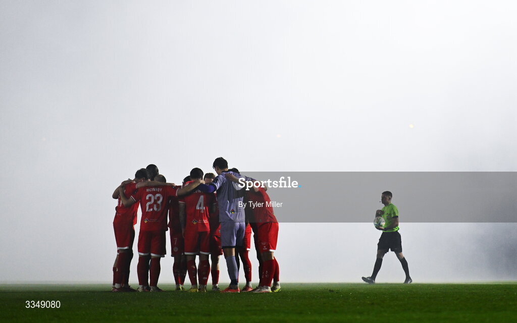 6 February 2026; Shelbourne players huddle as referee Lucas Keating prepares for kick-off before the SSE Airtricity Men's Premier Division match between Waterford and Shelbourne at the Regional Sports Centre in Waterford. Photo by Tyler Miller/Sportsfile