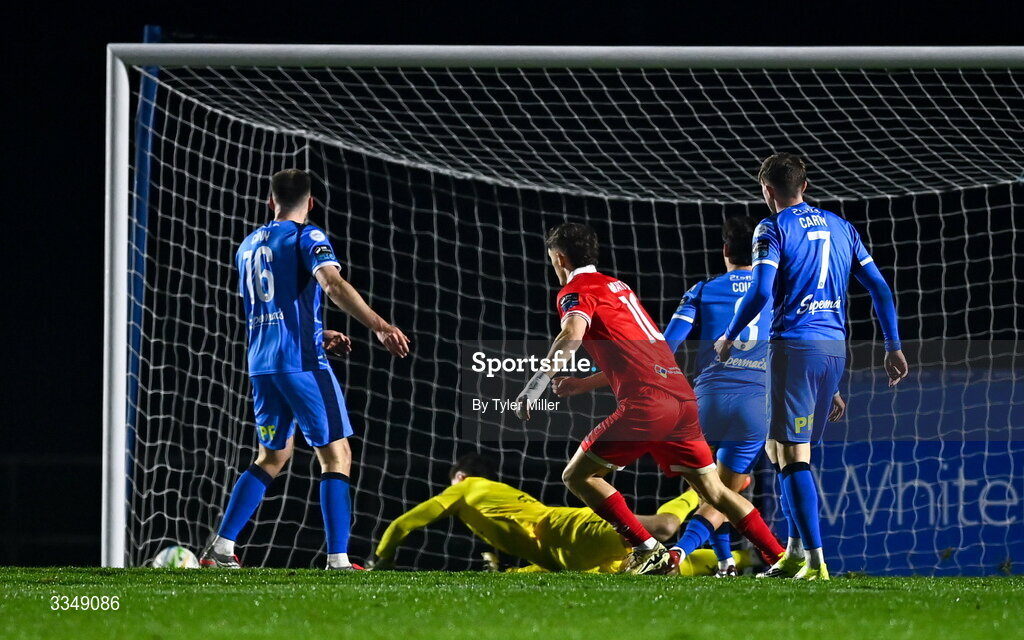 6 February 2026; John Martin of Shelbourne shoots to score his side's first goal during the SSE Airtricity Men's Premier Division match between Waterford and Shelbourne at the Regional Sports Centre in Waterford. Photo by Tyler Miller/Sportsfile