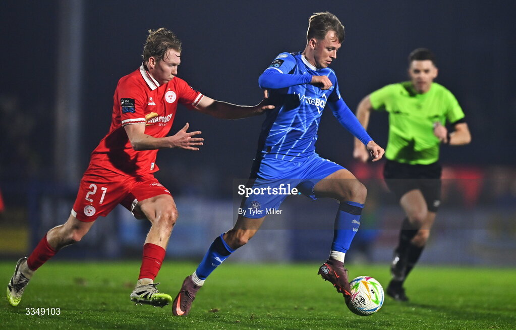6 February 2026; Conan Noonan of Waterford in action against Jack Henry-Francis of Shelbourne during the SSE Airtricity Men's Premier Division match between Waterford and Shelbourne at the Regional Sports Centre in Waterford. Photo by Tyler Miller/Sportsfile