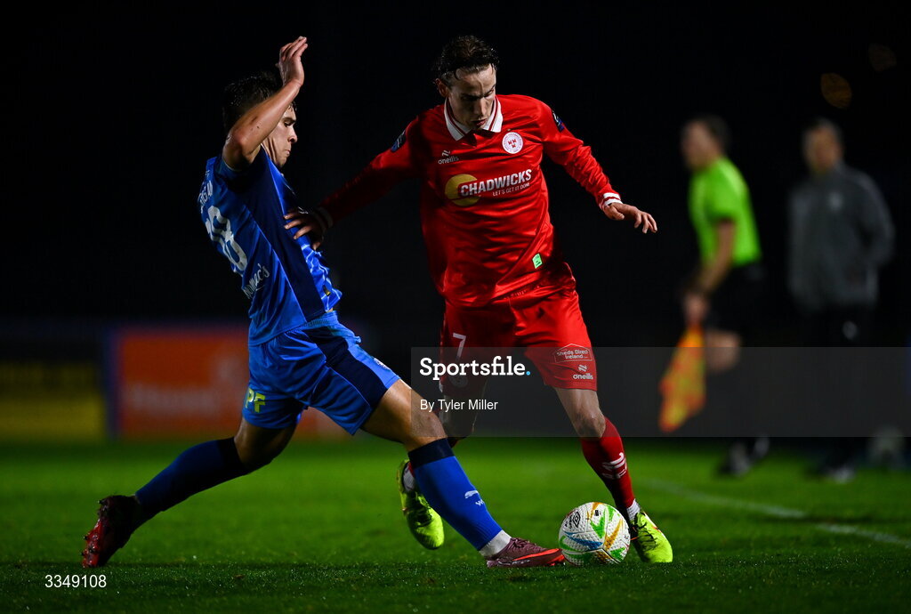 6 February 2026; Harry Wood of Shelbourne in action against Tommy Lonergan of Waterford during the SSE Airtricity Men's Premier Division match between Waterford and Shelbourne at the Regional Sports Centre in Waterford. Photo by Tyler Miller/Sportsfile