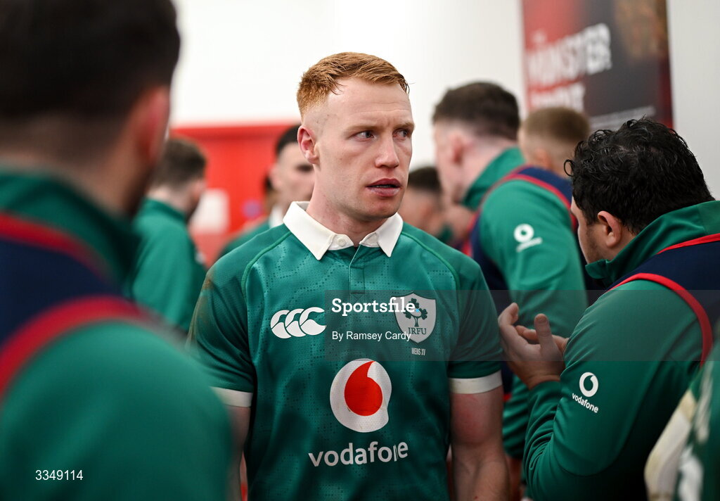 6 February 2026; Ciarán Frawley of Ireland XV makes his way to the pitch for the start of the second half of the representative fixture rugby union match between Ireland XV and England A at Thomond Park in Limerick. Photo by Ramsey Cardy/Sportsfile
