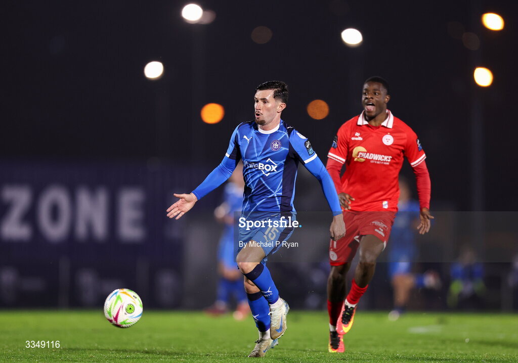 6 February 2026; Luke Heeney of Waterford in action against Mipo Odubeko of Shelbourne during the SSE Airtricity Men's Premier Division match between Waterford and Shelbourne at the Regional Sports Centre in Waterford. Photo by Michael P Ryan/Sportsfile
