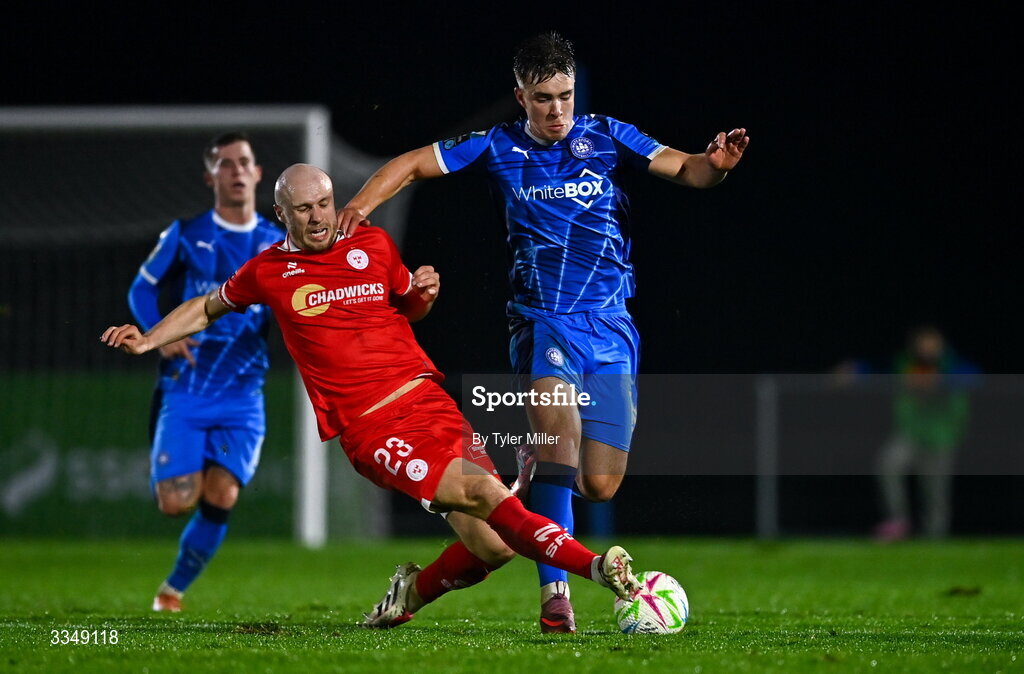 6 February 2026; Tommy Lonergan of Waterford is tackled by Kerr McInroy of Shelbourne during the SSE Airtricity Men's Premier Division match between Waterford and Shelbourne at the Regional Sports Centre in Waterford. Photo by Tyler Miller/Sportsfile