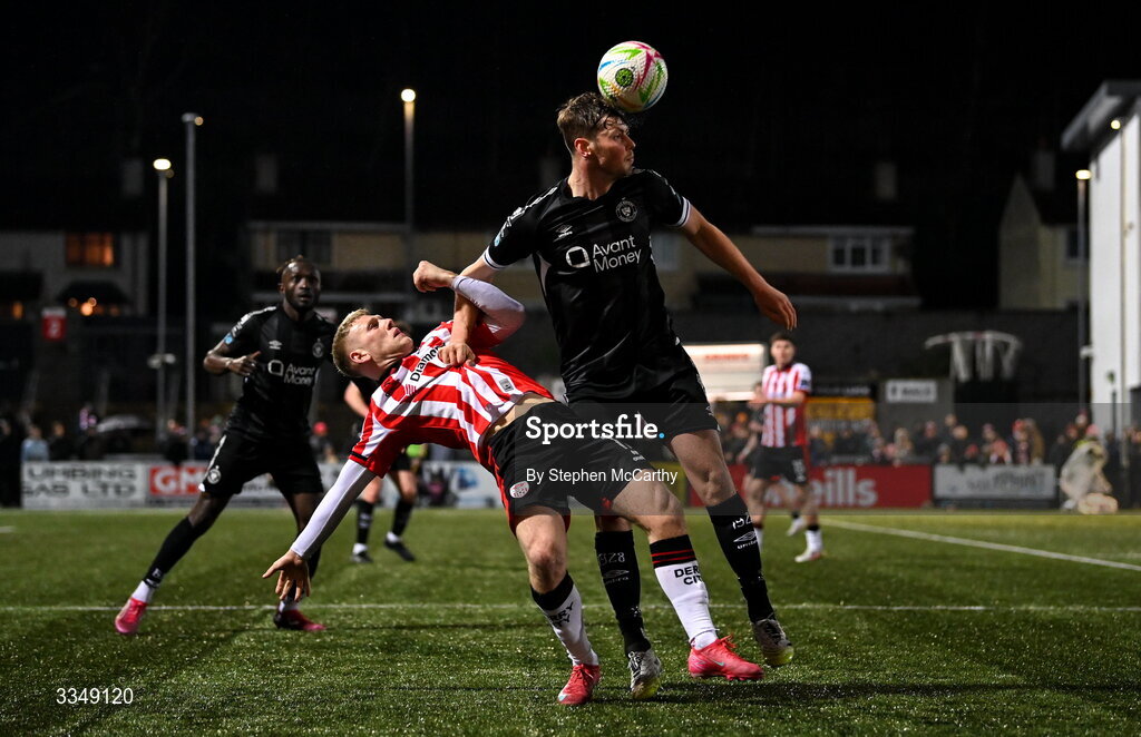 6 February 2026; Ollie Denham of Sligo Rovers in action against Josh Thomas of Derry City during the SSE Airtricity Men's Premier Division match between Derry City and Sligo Rovers at The Ryan McBride Brandywell Stadium in Derry. Photo by Stephen McCarthy/Sportsfile