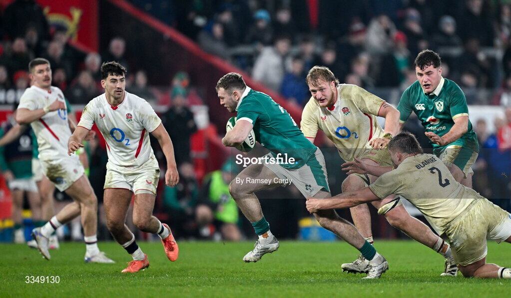 6 February 2026; Cathal Forde of Ireland XV makes a break to score his side's third try, which was subsequently disallowed for a knock on, during the representative fixture rugby union match between Ireland XV and England A at Thomond Park in Limerick. Photo by Ramsey Cardy/Sportsfile