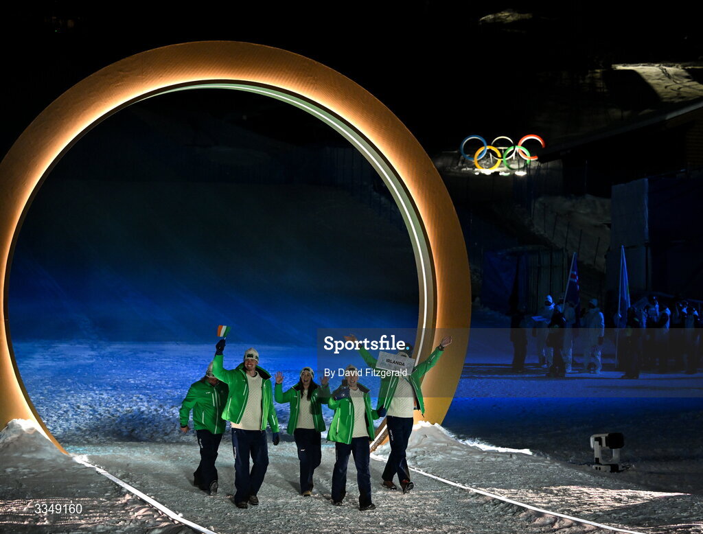 6 February 2026; Team Ireland during the opening ceremony of the Milano Cortina 2026 Winter Olympics at the Livigno Snow Park in Livigno, Italy. Photo by David Fitzgerald/Sportsfile
