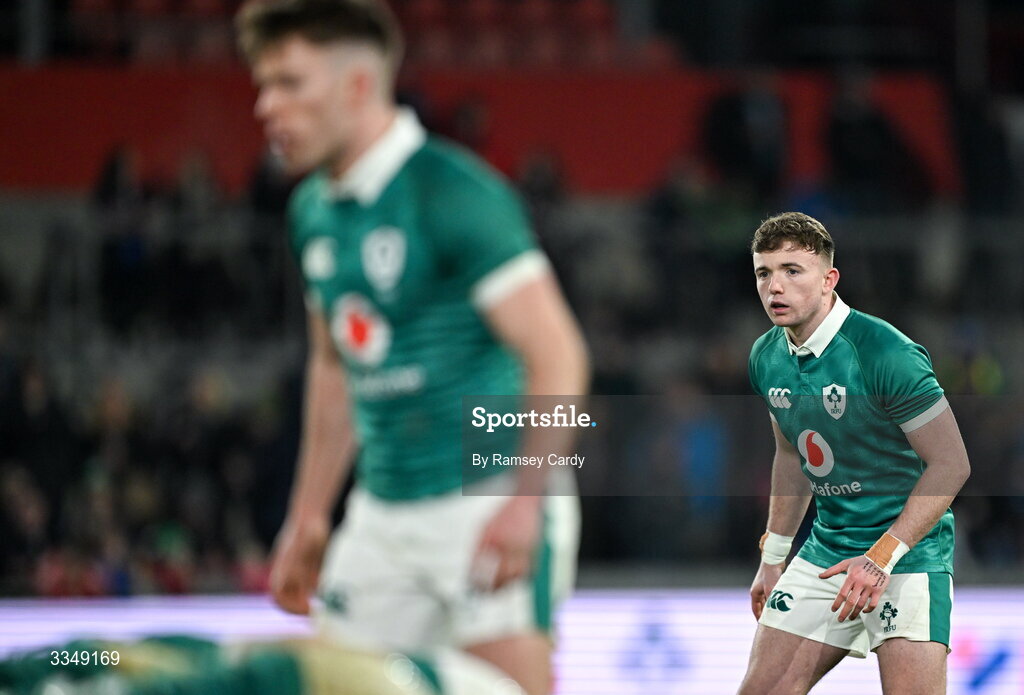 6 February 2026; Matthew Devine, left, and Jack Murphy of Ireland XV during the representative fixture rugby union match between Ireland XV and England A at Thomond Park in Limerick. Photo by Ramsey Cardy/Sportsfile