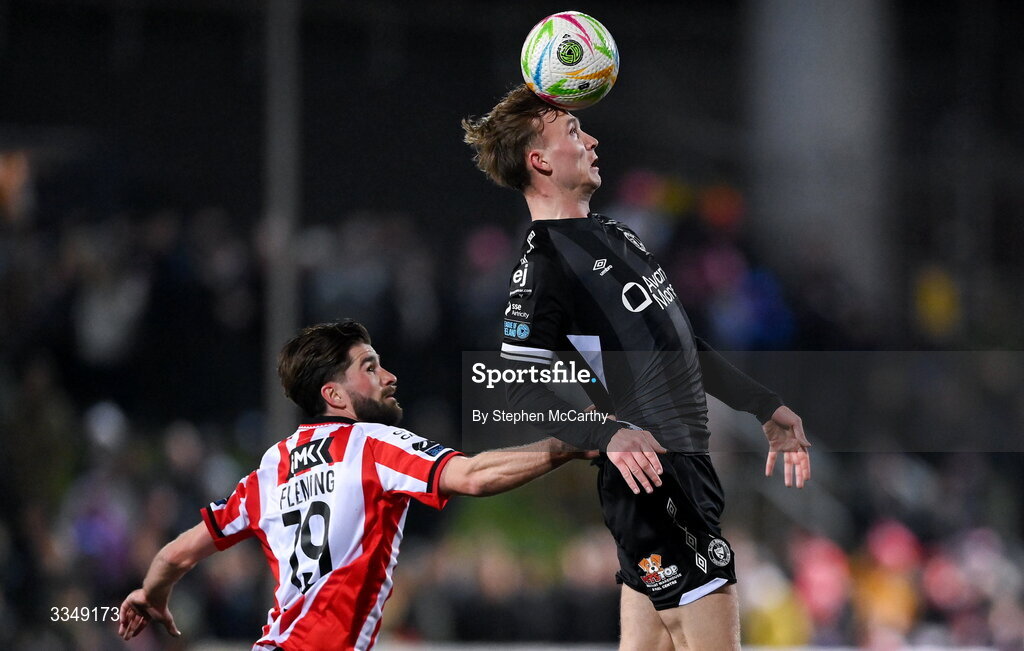 6 February 2026; Alex Nolan of Sligo Rovers in action against Brandon Fleming of Derry City during the SSE Airtricity Men's Premier Division match between Derry City and Sligo Rovers at The Ryan McBride Brandywell Stadium in Derry. Photo by Stephen McCarthy/Sportsfile