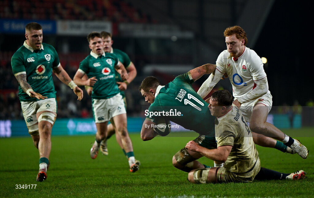 6 February 2026; Zac Ward of Ireland XV is tackled by Alex Dombrandt of England A during the representative fixture rugby union match between Ireland XV and England A at Thomond Park in Limerick. Photo by Ramsey Cardy/Sportsfile