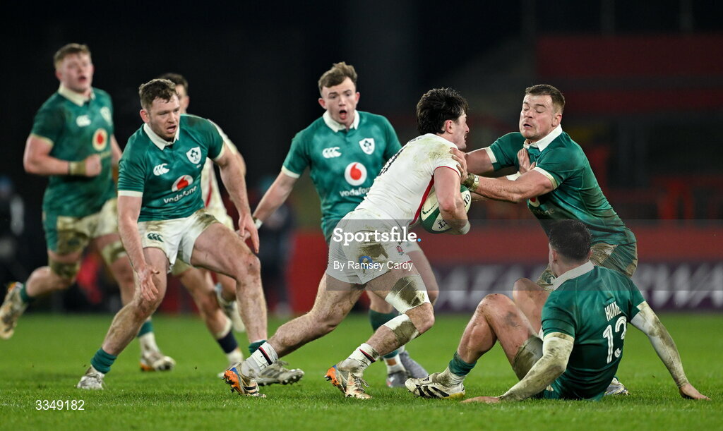 6 February 2026; Raffi Quirke of England A is tackled by Zac Ward of Ireland XV during the representative fixture rugby union match between Ireland XV and England A at Thomond Park in Limerick. Photo by Ramsey Cardy/Sportsfile