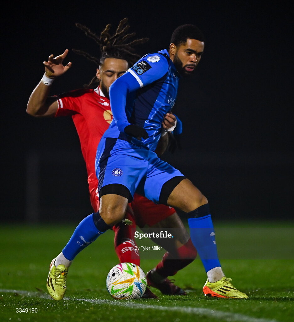 6 February 2026; Trae Coyle of Waterford in action against Milan Mbeng of Shelbourne during the SSE Airtricity Men's Premier Division match between Waterford and Shelbourne at the Regional Sports Centre in Waterford. Photo by Tyler Miller/Sportsfile