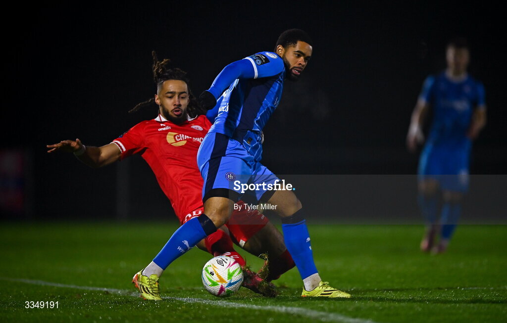 6 February 2026; Trae Coyle of Waterford in action against Milan Mbeng of Shelbourne during the SSE Airtricity Men's Premier Division match between Waterford and Shelbourne at the Regional Sports Centre in Waterford. Photo by Tyler Miller/Sportsfile