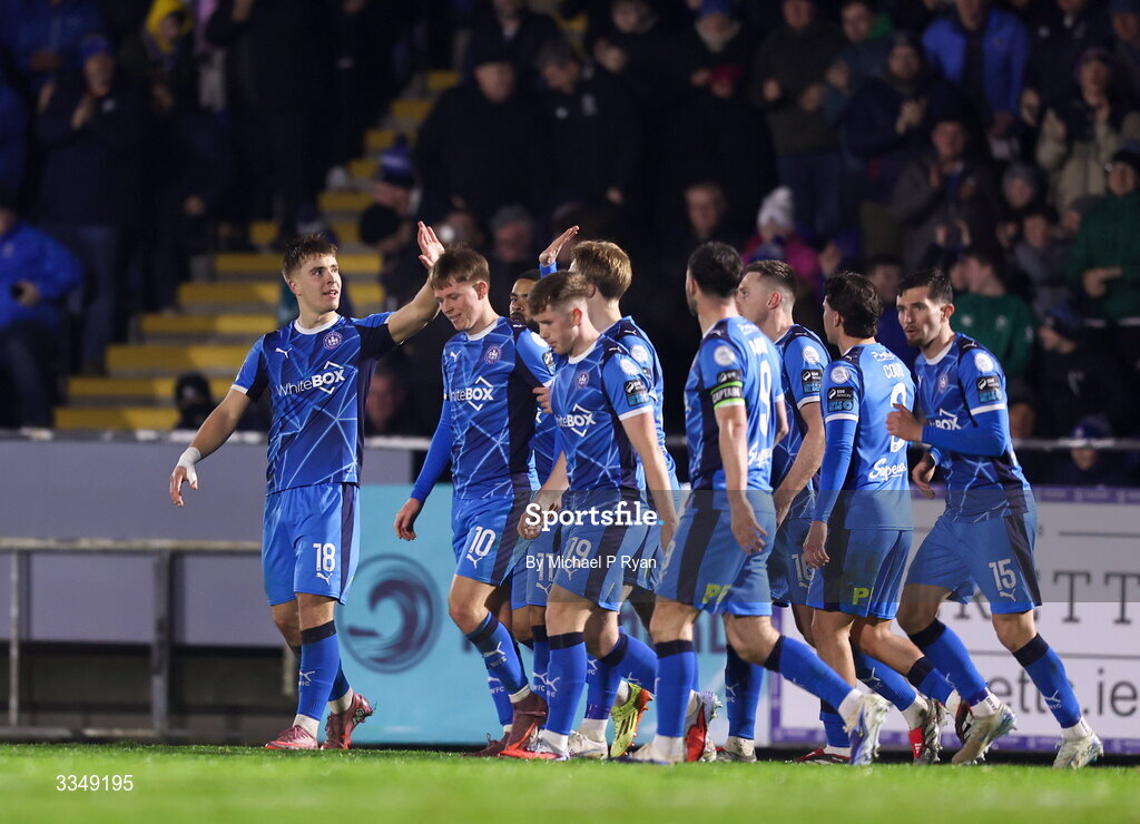 6 February 2026; Tommy Lonergan of Waterford left, celebrates after scoring his side's first goal during the SSE Airtricity Men's Premier Division match between Waterford and Shelbourne at the Regional Sports Centre in Waterford. Photo by Michael P Ryan/Sportsfile