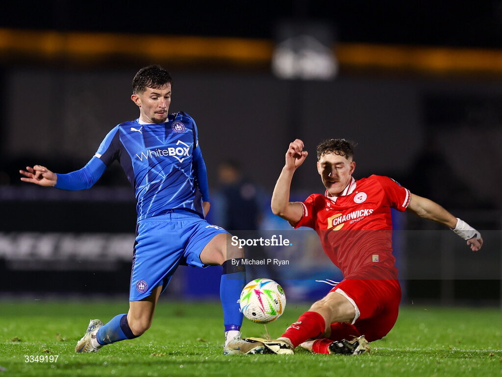 6 February 2026; Luke Heeney of Waterford is tackled by John Martin of Shelbourne during the SSE Airtricity Men's Premier Division match between Waterford and Shelbourne at the Regional Sports Centre in Waterford. Photo by Michael P Ryan/Sportsfile