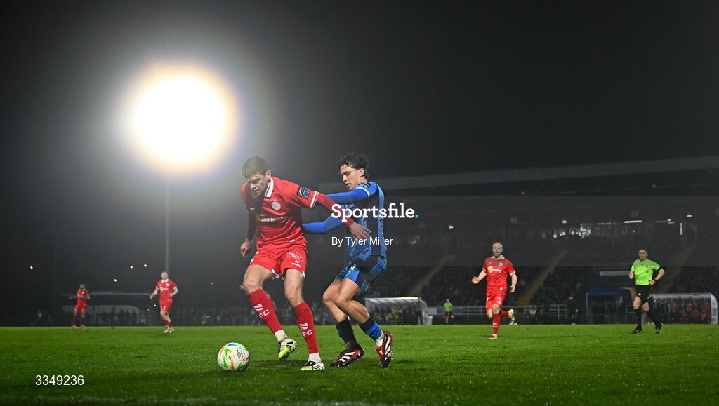 6 February 2026; Sean Gannon of Shelbourne in action against Benny Couto of Waterford during the SSE Airtricity Men's Premier Division match between Waterford and Shelbourne at the Regional Sports Centre in Waterford. Photo by Tyler Miller/Sportsfile