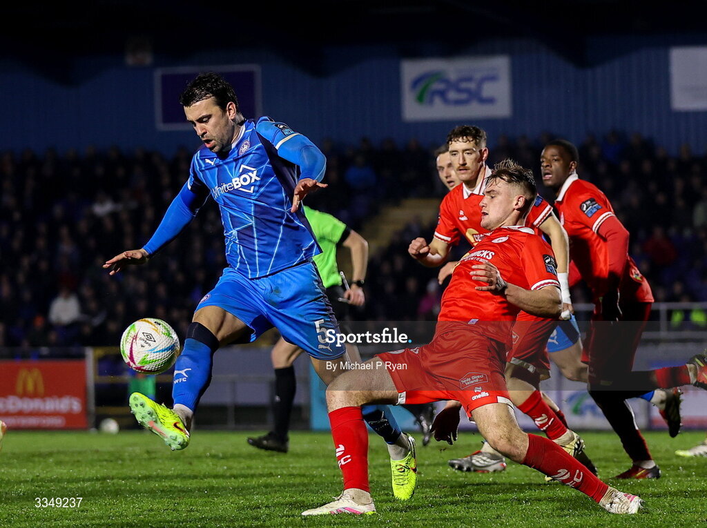 6 February 2026; John Mahon of Waterford in action against JJ Lunney of Shelbourne during the SSE Airtricity Men's Premier Division match between Waterford and Shelbourne at the Regional Sports Centre in Waterford. Photo by Michael P Ryan/Sportsfile