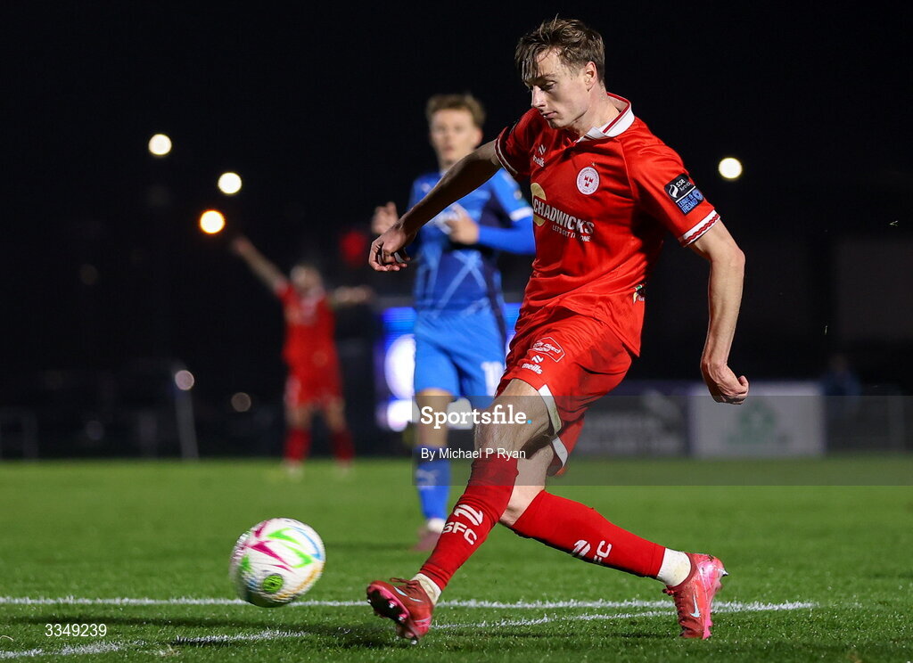 6 February 2026; Daniel Kelly of Shelbourne during the SSE Airtricity Men's Premier Division match between Waterford and Shelbourne at the Regional Sports Centre in Waterford. Photo by Michael P Ryan/Sportsfile