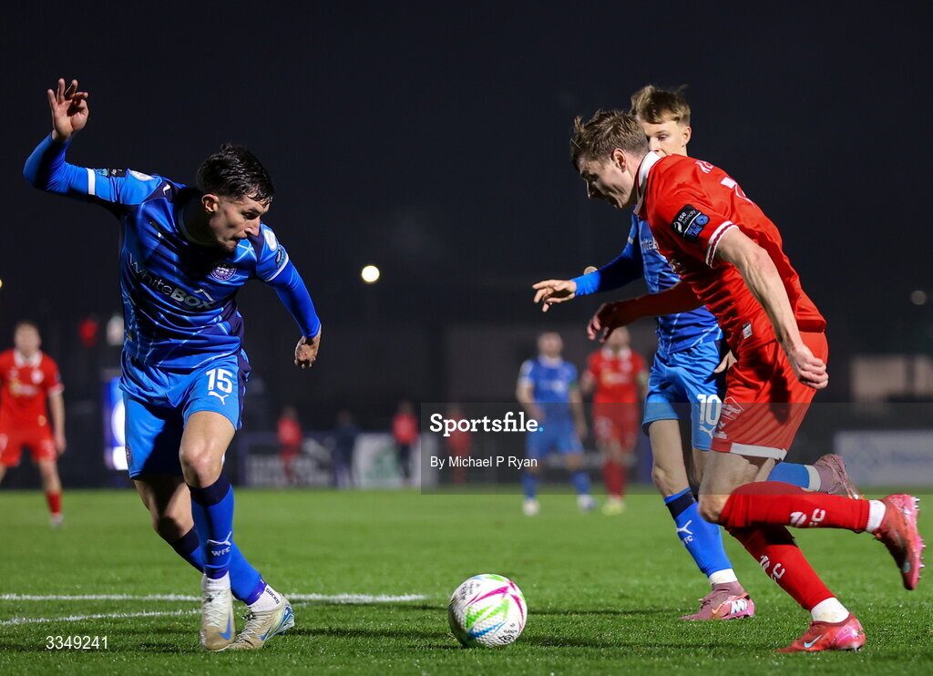 6 February 2026; Daniel Kelly of Shelbourne in action against Luke Heeney of Waterford during the SSE Airtricity Men's Premier Division match between Waterford and Shelbourne at the Regional Sports Centre in Waterford. Photo by Michael P Ryan/Sportsfile