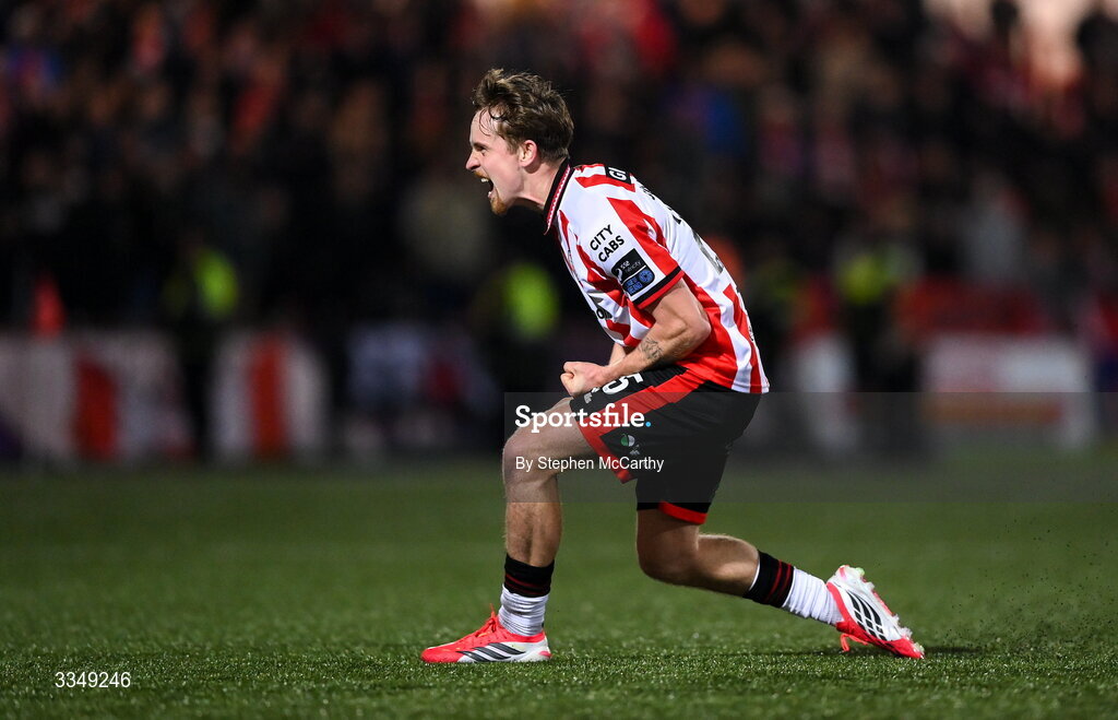 6 February 2026; Alex Bannon of Derry City celebrates after scoring his side's first goal during the SSE Airtricity Men's Premier Division match between Derry City and Sligo Rovers at The Ryan McBride Brandywell Stadium in Derry. Photo by Stephen McCarthy/Sportsfile